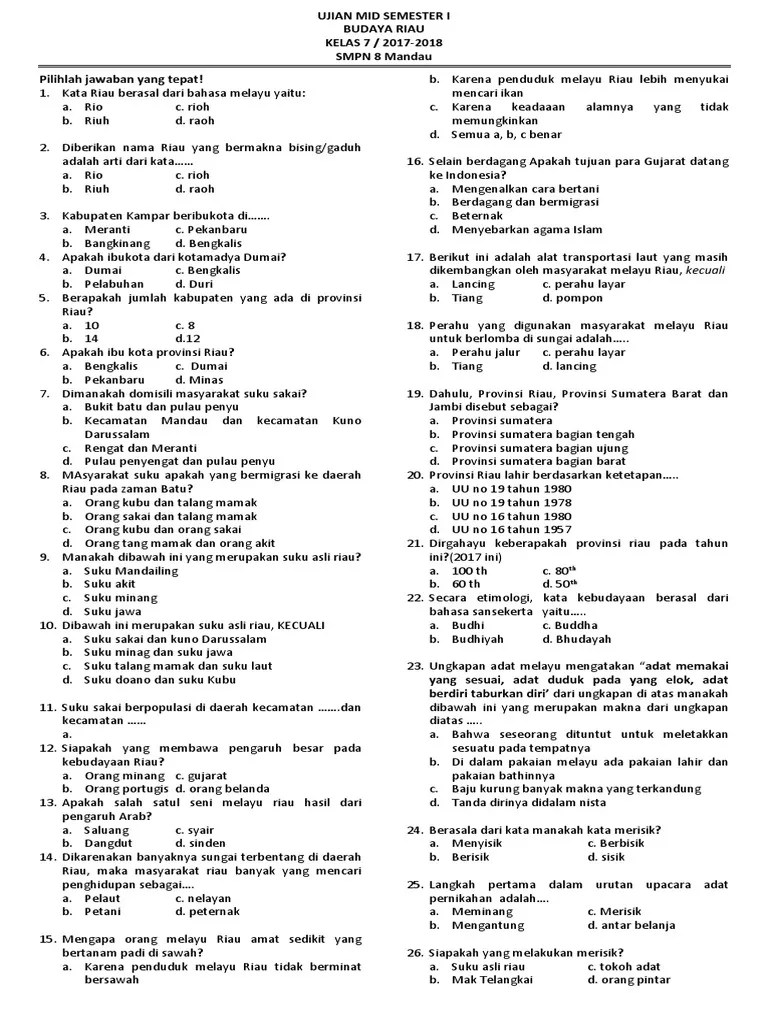 Contoh soal uas kelas 6 semester 1. Berlangsungnya penyebaran bangsa dan budaya melayu austronesia ke nusantara b. Soal ulangan tengah semester 2 tahun pelajaran 20182019 lembar soal. 100% original untuk anak kelas 11 sma/smk/ma berdasarkan kurikulum muatan lokal riau penulis drs. Soal budaya melayu riau kelas 11 semester 2 guru ilmu sosial lela .